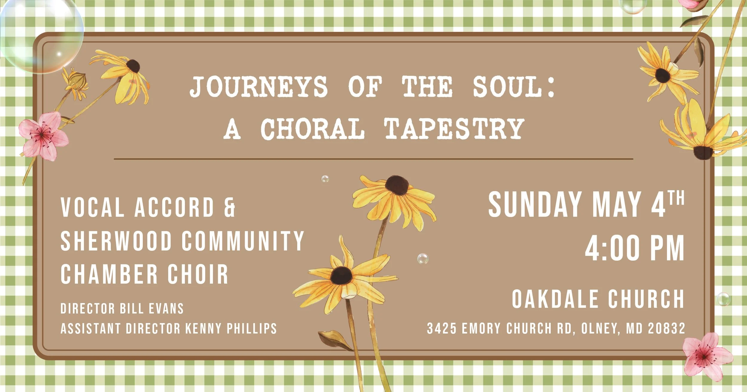 Join the Sherwood Community Chamber Choir and Vocal Accord (formerly the Sherwood Community Chamber Ensemble) for an afternoon of moving and uplifting choral music in Journeys of the Soul: A Choral Tapestry. This spring concert explores the deep connections between music, spirituality, and the natural world through a diverse program featuring American folk songs, spirituals, and contemporary choral works.